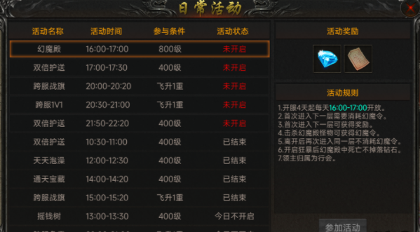 每天有多个日常活动可参加,玩家可在活动时间内并且达到参与条件即可参加活动。