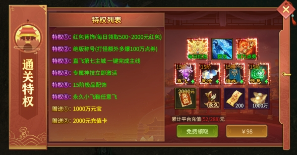 活动规则:累计平台充值金额,或者直购即可解锁通关特权,领取对应特权奖励