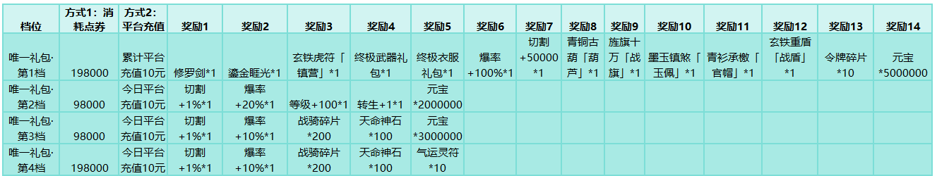 活动规则:累计平台充值金额,或消耗点券即可购买唯一礼包,达到指定条件后,唯一礼包会切至下一档位,并且礼包存在一定购买次数限制。