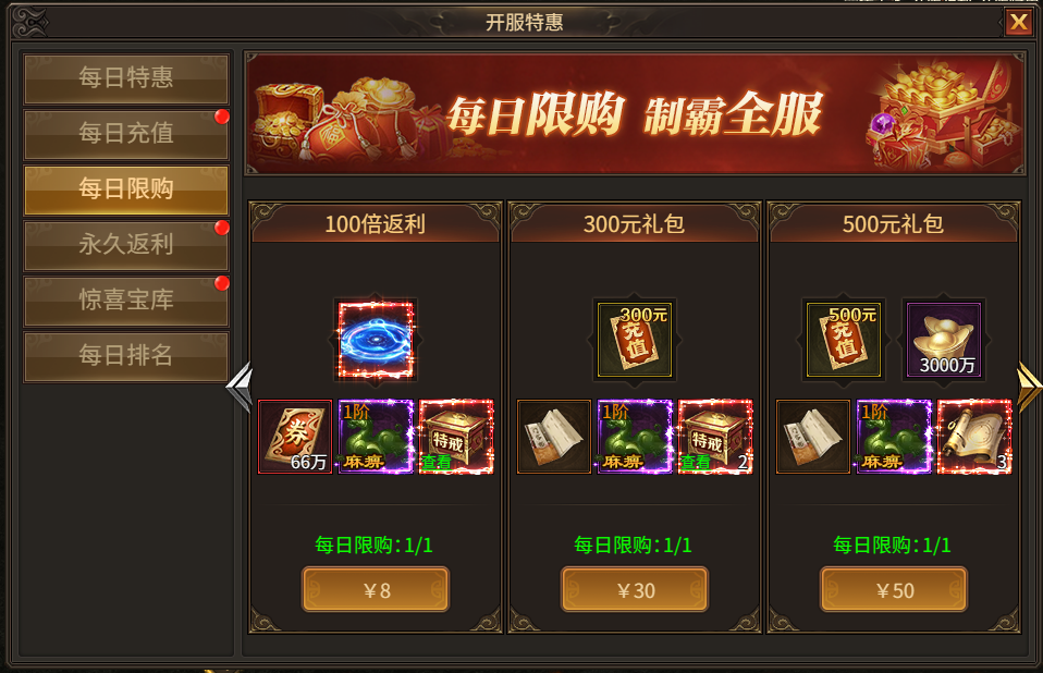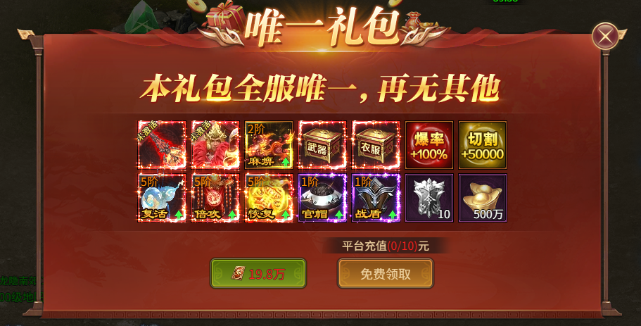 活动规则:指定主城内存在特殊礼包,累计平台充值金额达标(或者消耗点券购买)即可领取对应大礼