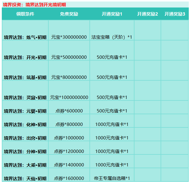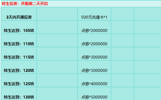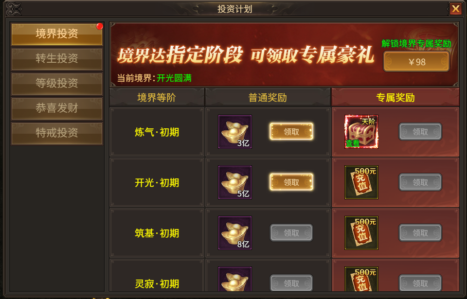 活动时间:境界投资达到开光境开启,转生投资、等级投资等等按开服时间开启