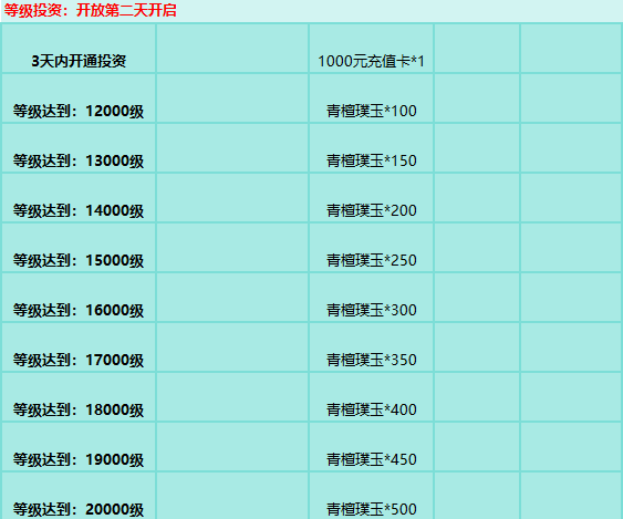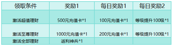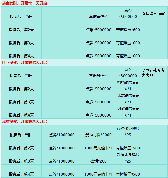 活动规则:开通对应投资,并达到对应投资要求的目标,则可领取大量稀有道具奖励