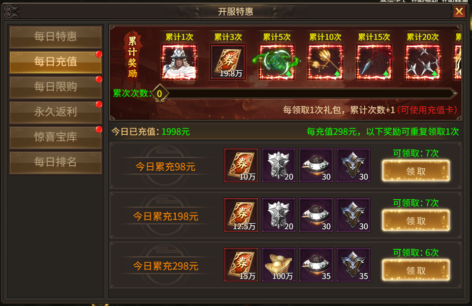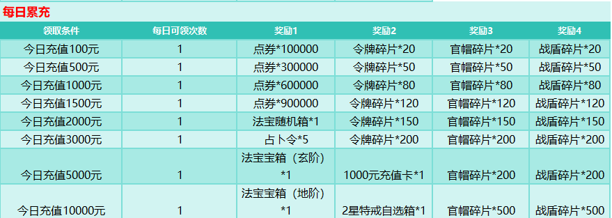 活动规则:活动持续期间,每日充值达到一定金额,即可领取奖励,累计一定次数后还有额外道具可领