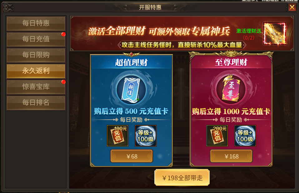 活动规则:激活永久返利,可获取大量充值和等级,打包购买持续收益翻倍,还可获得特殊神兵