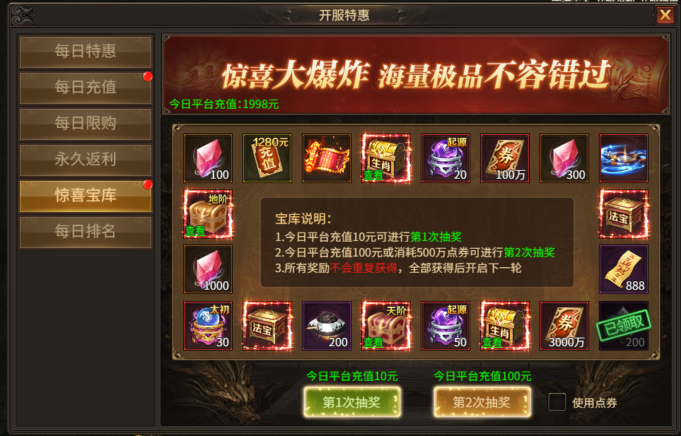 活动规则:每日达到指定条件,或者消耗点券可进行抽奖,每日最多进行两次抽奖,奖池道具不会重复获得,全部奖励获得后隔日进入下一轮