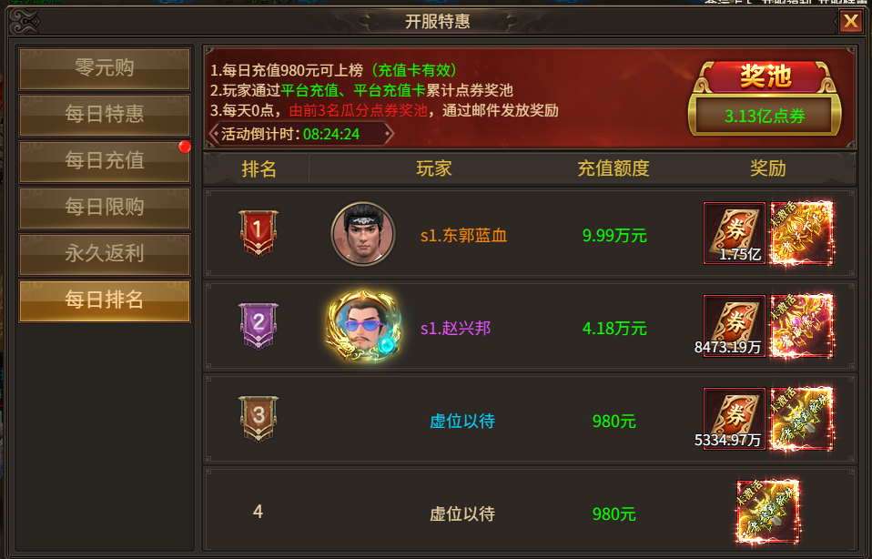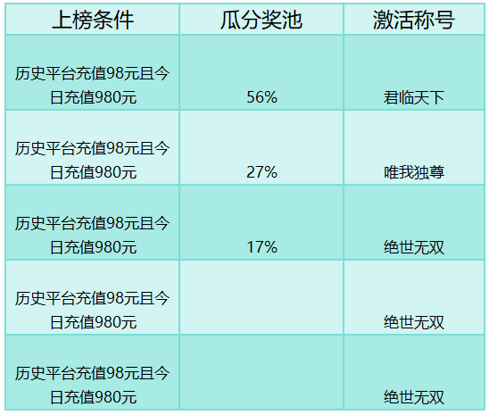 活动规则:累计平台充值达到98元可参与,每日排名越高的玩家,获得点券返利则越高