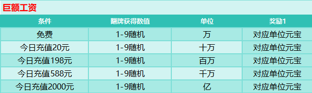 活动规则:超高返利充值,档位首次充值赠送大量稀有道具,后续充值亦是十倍效益