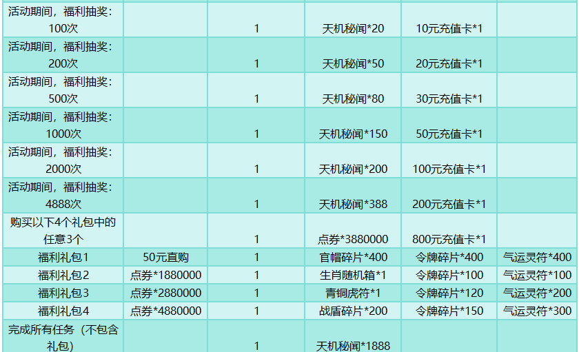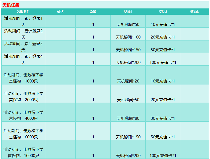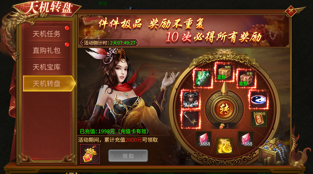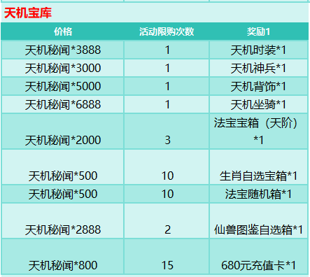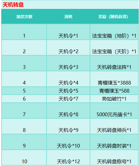 活动规则:完成对应任务获取天机秘闻、天机令,即有机会在天机宝库,天机转盘获取极品道具奖励