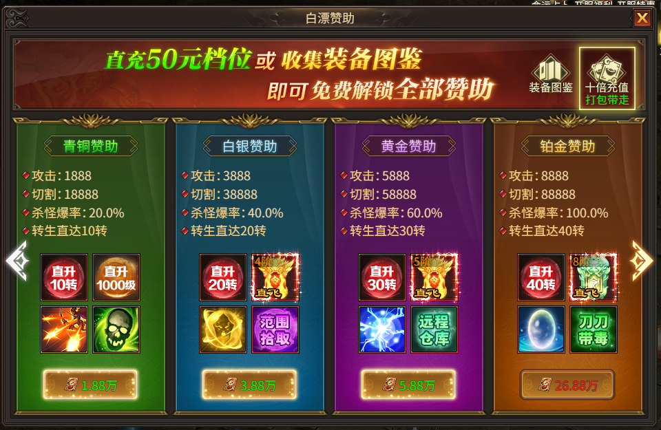 活动规则:白嫖赞助可通过收集装备图鉴、消耗点券免费白嫖,获得大量攻击、切割、爆率属性,还有特殊技能及权限。也可通过购买十倍充值指定档位直接激活全部权限。