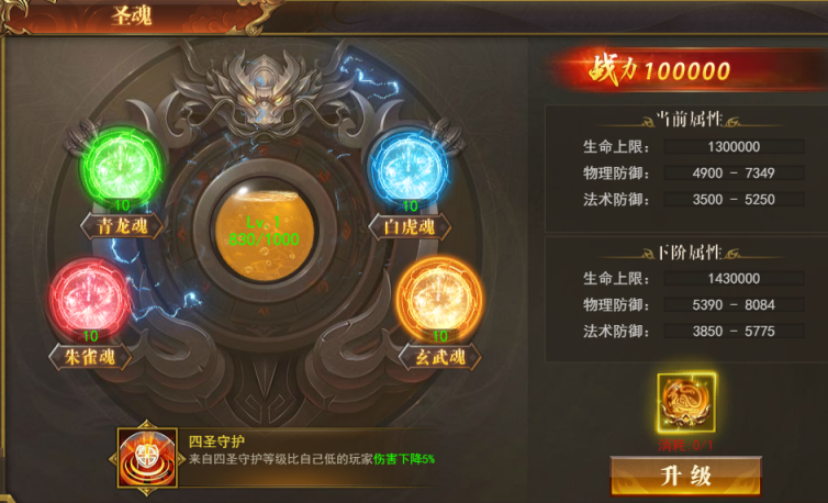 6、新增血脉圣魂,开服30天开启,入口:血脉-圣魂,升级可激活四圣守护获得百分比属性加成和伤害下降效果