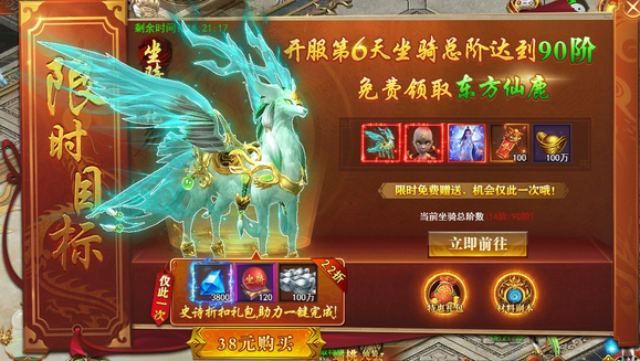 除了可以免费领取到东方仙鹿外,还可领取红孩儿、倾城无双大乔图鉴、100境界令、100万元宝,如实在达不到御兽90阶要求,还可38米激活史诗哲寇礼包,内含3800钻石、120御兽进阶丹、100万银两,2.2折史诗级礼包,助力一键完成。