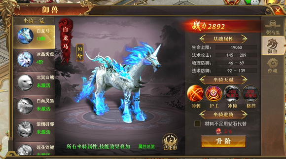 提升坐骑阶数,要用到坐骑进阶丹。每个御兽坐骑都能用此丹单独培养,并且所有坐骑属性效果会叠加。坐骑进阶丹可通过材料副本、参与游戏活动获取。若材料不足,也可在游戏商城购买。