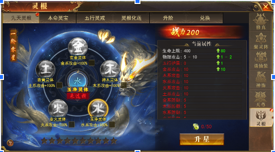 激活先天灵根对应灵体可增加100%对应五行攻击,每人仅可激活一种灵体,每日可消耗钻石重新选择一次灵体(每日限一次)。