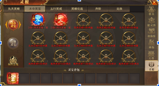 选定先天灵体后可装备本命灵宝,装备攻击、防御型时本命灵宝可获取对应五行属性,提升先天灵根阶数可装备更多本命灵宝。