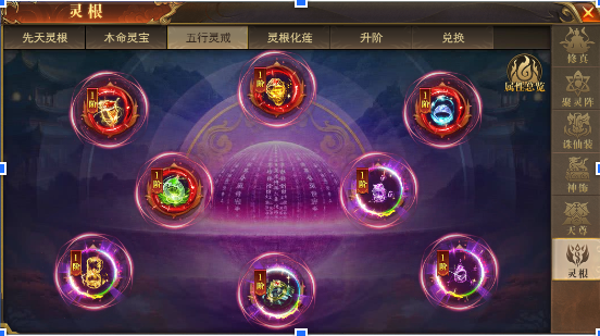 消耗灵根精华蕴养先天灵根可获得五行属性并获得五行护盾(灵根精华可通过回收多余的本命灵宝获取);
