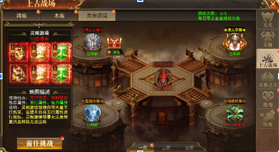 开服达标90天开启,每日挑战5次,每日0点重置次数,可获取本命灵宝、五行灵戒,提升灵宝总等级可前往更高层灵根源境;