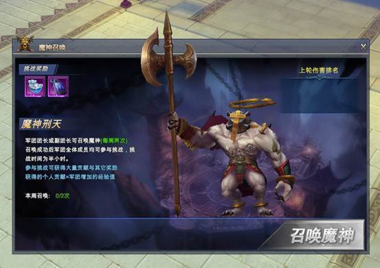 每周可由军团长或副团长召唤两次魔神,召唤后,所有成员在魔神出现的时间段内都可以挑战该魔神,根据成员对魔神造成的伤害进行排名,发放军团贡献及其它奖励