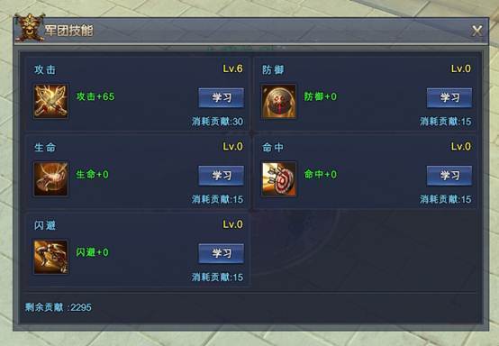 玩家通过消耗【军团贡献】来学习【军团技能】,军团技能可以提高本军团成员的基础属性