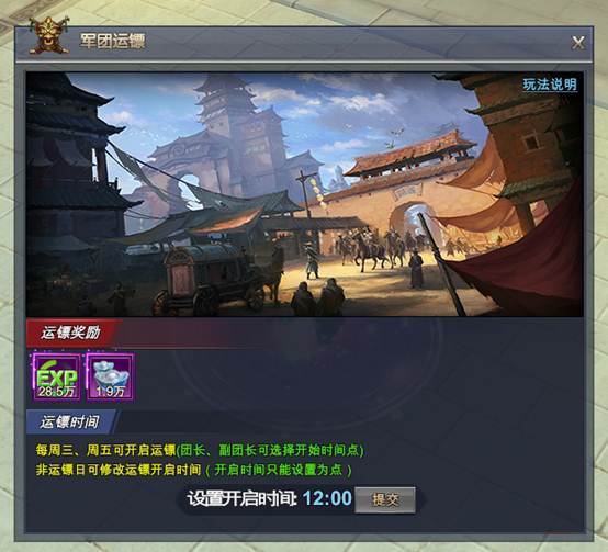 默认每周三、五中午开启军团运镖活动,本军团成员都可以参加,将镖车安全交付给NPC后,参与运镖的所有成员将获得丰厚的奖励。在非运镖日,团长和副团长可以自行设定军团运镖的开启时间点。