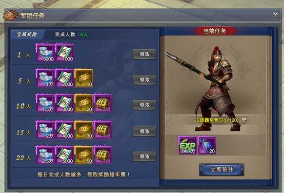 军团成员每天可接受一次军团任务,以获得经验及军团贡献值,当本军团完成任务的人数达到1、5、10、15、20时,军团成员可以领取额外的奖励;