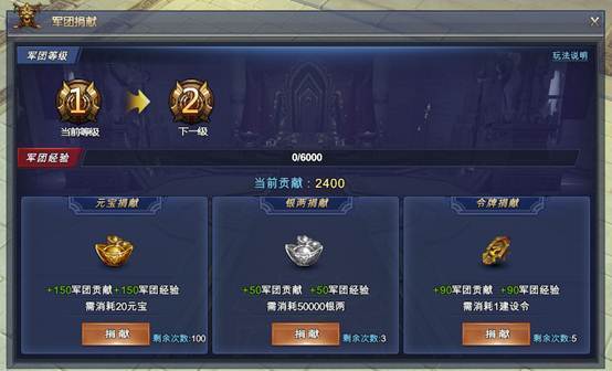 玩家每日可以给军团捐献一定的元宝、银两或是建设令,从而提升军团的经验,当军团经验达到下一级时,即会自动升级。当玩家进行军团捐献时,也会获得【军团贡献】值,【军团贡献】值可以在【军团商店】购买特殊道具。每天玩家可捐献的次数是固定的,但VIP玩家可以进行额外的元宝捐献;