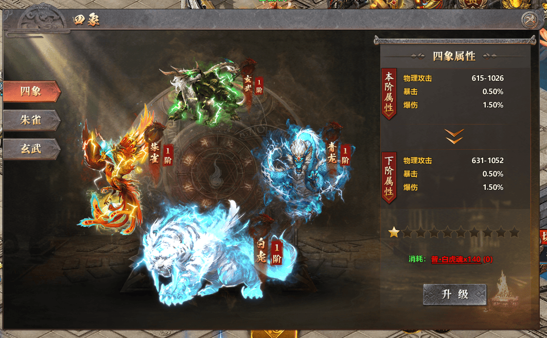 1、升级四象可提升四象属性,获得更多暴击、爆伤、首领伤害、幸运等特殊属性。