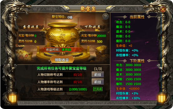 完成所有任务可提升聚宝盆等级,提高收益以及大量属性!
