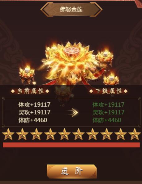 每个莲台均有十颗星,使用“莲台经验药”来提升莲台星,当十颗星满后可进行莲台进阶,进阶时需要消耗少量的铜钱,莲台成功进阶后自动激活更高阶的莲台。等级越高的莲台,所获得的属性战力越高。