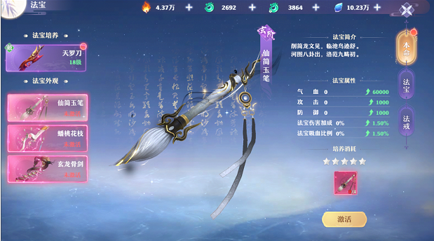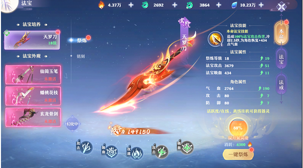 完成主线任务获得本命法宝,祭炼法宝提升法宝属性和角色属性。