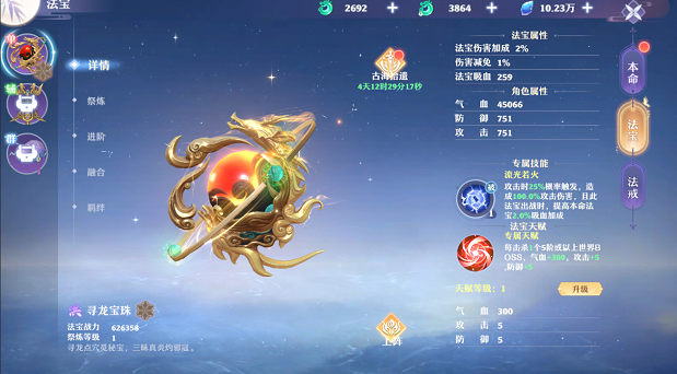 天命法宝不但额外增加法宝属性和角色属性,还额外提供专属技能和法宝天赋。