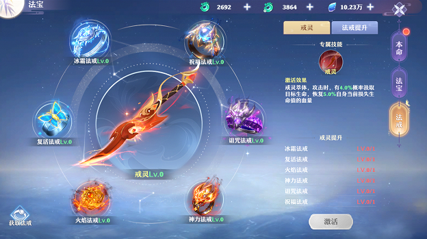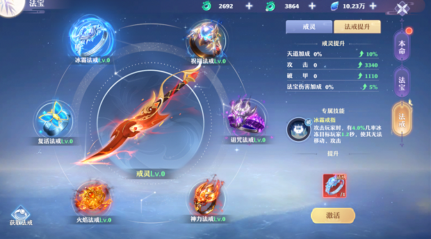 法戒额外提供属性加成和专属技能,激活戒灵还有额外的专属技能。
