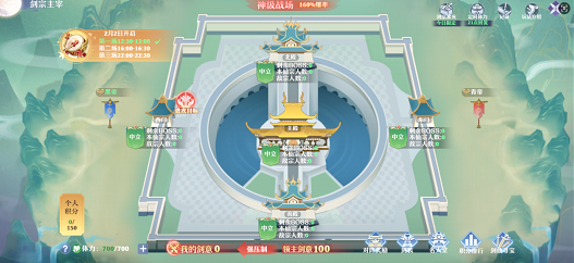 2. 周一或者周四开启助威活动,将先开启仙宗助威阶段;玩家可对本仙宗进行助威,按玩家战力增加仙宗助威值;助威值每半小时将刷新一次,刷新已助威玩家的最新战力;助威值越高仙宗排名越前,进入更高级的剑宗战场;