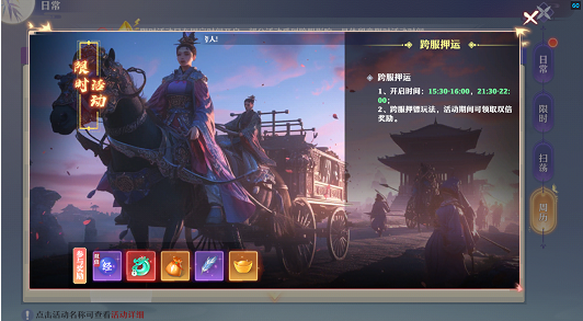 3. 跨服押镖玩法,活动期间可以领取双倍奖励;