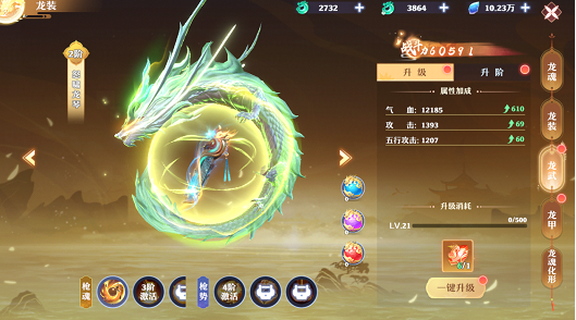 激活龙魂,获得龙魂外显,龙魂技能及额外属性加成,超炫龙魂外观彰显自身实力。提升龙魂激活提升龙魂技能,进一步提升战力。