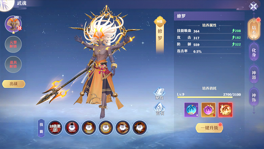 完成主线任务获得武魂化身,战斗时可化身武魂,施展武魂技能,并额外提升属性,进行培养武魂,进一步提升属性,增强战力。