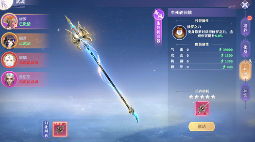 每位武魂有对应神器,激活神器获得武魂神器外显,额外增加技能及属性,提升战斗实力。