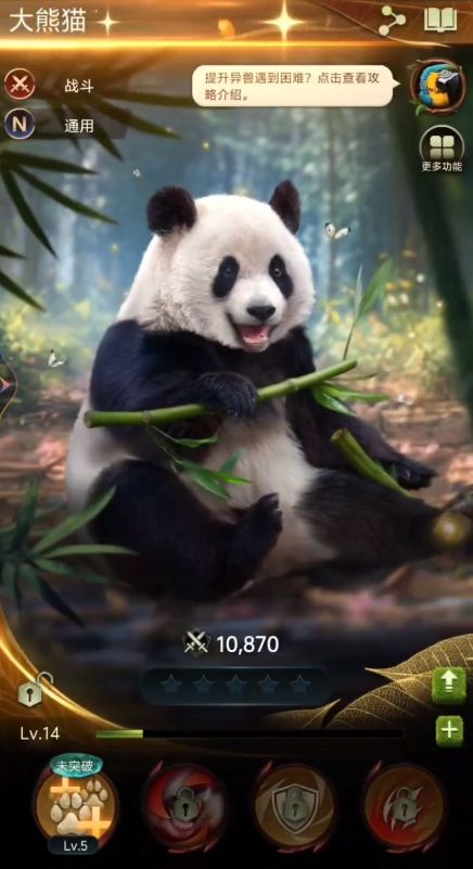 后期想要升级进化大熊猫,只需要获取对应的碎片,玩家可通过异兽召集、成长计划、碎片合成以及每周的兽群活动收获更多大熊猫。